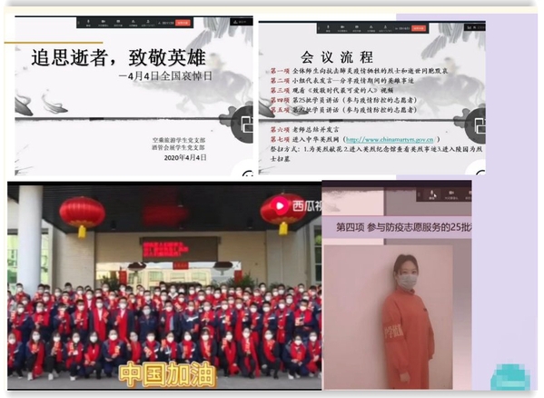 旅游与空乘党支部全体党员通过分享61位牺牲医护人员事迹后,伴随着防空警报和汽笛声的响起,集体默哀三分钟。随后通过网络祭祀平台“思念堂”为抗击疫情中牺牲的烈士敬献贡品并发悼念感言。支部书记焦巧表示:“全体党员通过今天的集体祭奠,感触很深。我们会坚决贯彻以习近平同志为核心的党中央的指示要求,在疫情防控工作和日常教学工作中,站好自己的岗位,不忘初心,积极履职、临危不惧、勇于担当、主动作为,充分发挥党员先锋带头作用。”酒店管理党支部15名党员则在支部QQ群里抒发自己的缅怀之情:任婷老师创作一首七言律诗表达对逝去英雄的敬意和对家乡人民的激励;支部书记孙嫘老师陪同女儿作诗、画画,取名《希望》……