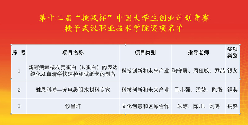11月28日,全国总决赛线上终审答辩拉开帷幕。武汉职业技术学院生物工程学院《新冠病毒核衣壳蛋白(N蛋白)的表达纯化及血清学快速检测试纸卡的制备》项目团队从项目背景、实践过程、社会价值、团队协作等方面进行展示。专家评委对项目成员在疫情最吃紧时坚守武汉、潜心研究,免费赠送、无偿公开等行为表示敬佩,并对项目团队后期与合作企业共同研发新冠病毒快速检测试纸卡,为抗击新冠肺炎疫情作出贡献点赞。在随后的答辩环节,我校学子表现沉着,回答精准精彩,受到专家评委一致好评。