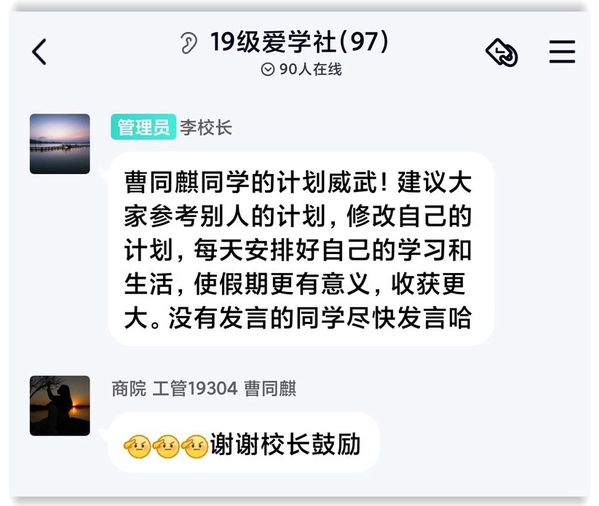 “每日打卡背诵50个单词”“学习236节专升本网课并做好笔记”“学习厨艺,每周为家人做一次饭”……收到活动通知,群内顿时热闹起来。爱学社社员们纷纷在社团QQ群晒出假期计划,或备考英语四六级、计算机二级等各类等级证书考试,或准备专升本,或自学编程,或练习厨艺,或参加社会实践,期待拥有一个缤纷多姿又富有意义的寒假。
