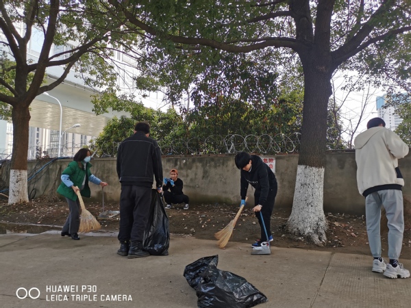 ——进公共场所。3月4日,志愿者们分别在关山校区和光谷东校区同时开展。在关山校区,志愿者们手拿扫帚、铁锹、钳子、垃圾袋等清洁工具,沿着凌曦楼到第一、第二工业中心,充分发扬不怕脏、不怕累的艰苦奋斗精神,将废弃纸屑、枯树枝叶、水沟淤泥、路边杂草、零星装修垃圾都清理一空。这边几个人用扫帚把纸屑、食品包装袋清扫完毕,随后就有人把垃圾桶推过来,老师在现场讲解垃圾分类知识,学生进行垃圾分类收集,现学现用,大家配合甚是默契。经过一个多小时的努力,绿化带、卫生死角得到了彻底清理,面貌焕然一新。虽然“汗水与尘土齐飞”,但师生脸上洋溢着欢乐的笑容,深刻体味着奉献的伟大和劳动的可贵。