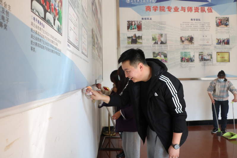 春意盎然的东逸大道上、碧波荡漾的凌波湖畔、绿草茵茵的操场边,师生们不怕脏、不怕苦、不怕累,干劲十足,或拿起抹布仔细擦拭窗台和桌椅,或手持扫帚、簸箕等劳动工具,将散落在道路上的落叶、纸张等集中装入塑料袋。师生们迸发出极大的劳动热情,现场一派热火朝天的景象。经过师生一个下午的通力合作,学校公共区域、学生宿舍及教学楼的环境面貌焕然一新。