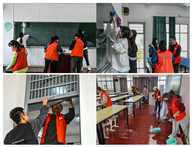 外语外贸学院37名教师党员积极响应,与学生一同参与全校卫生大扫除活动,打扫凌峰楼23间教室及公共区域。商英19301班发展对象孙向蓉十分意外的说道:“没想到老师和我们一起参加大扫除,为我们的劳动实践课增添了一抹‘红’色。作为新时代的青年,我们要从劳动实践中体会到劳动教育的深刻内涵,为建党一百周年献上武职学子的初心和信仰。 ”