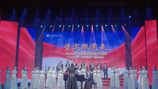 颁奖典礼以“坚定跟党走”为主题,分为“青春向党•情系家国”“学生群星•闪耀武职”“建功有我•筑梦时代”三个篇章。通过歌唱比赛、文化展演、情景再现、颁奖仪式等方式,融思想性、舞台化、艺术性、仪式感于一体,全方位、多角度展现武职青年师生的家国情怀、爱校热忱、拼搏镜头和成绩收获,激励全体武职青年励精图治、成长成才,用蓬勃振奋的精神面貌喜迎中国共产党成立100周年。