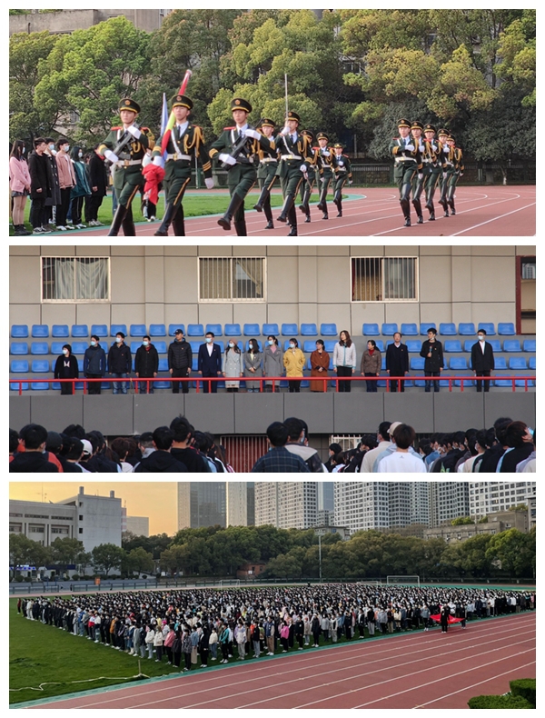 上午6时50分,国旗仪仗队队员昂首挺胸,齐整戎装,迈着铿锵有力的步伐护送鲜艳的五星红旗入场,伴随着雄壮激昂的《义勇军进行曲》,五星红旗冉冉升起,迎风飘扬。