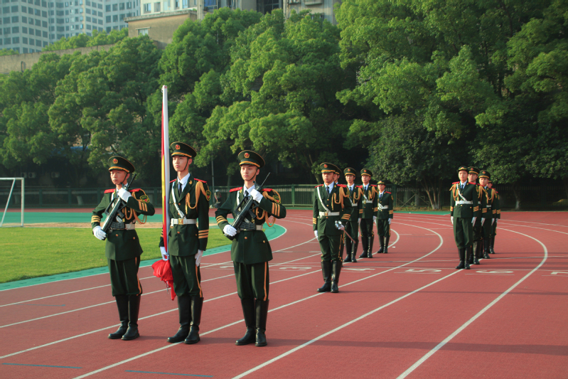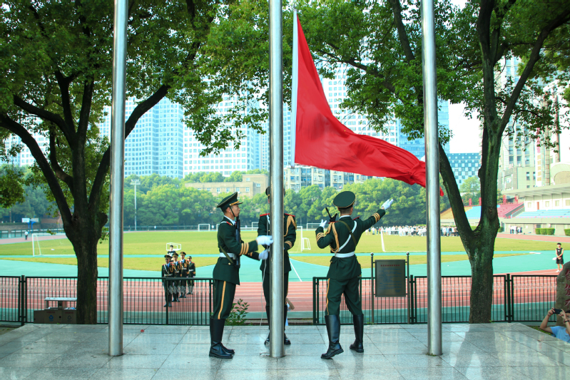 上午6时50分,国旗仪仗队队员英姿飒爽、迈着坚定有力的步伐护送五星红旗入场。伴随着庄严的《义勇军进行曲》,五星红旗缓缓升起,迎风飘扬。