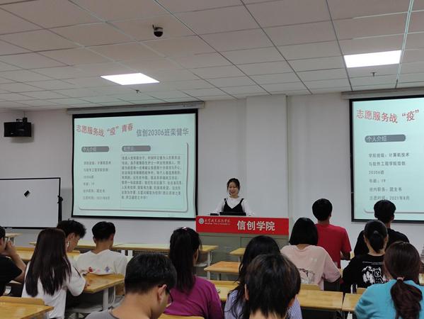 信创20306班团支部开展以“战‘疫’有我,‘青’尽全力”为主题的团会活动,分享抗疫青年的典型事迹,并围绕红色精神、志愿精神和抗疫精神展开热烈讨论。团支书栾建华说:“作为入党积极分子,我们要向革命先烈和抗疫先锋学习,学习他们的善良和勇敢,传承他们的责任和担当,接力他们对党的事业的挚爱与付出,铭记历史使命和责任,为国家和社会贡献力量。”