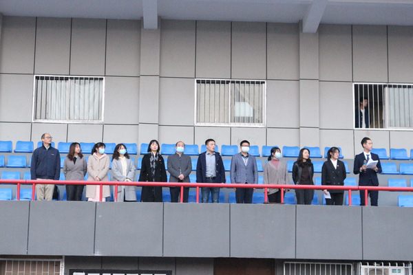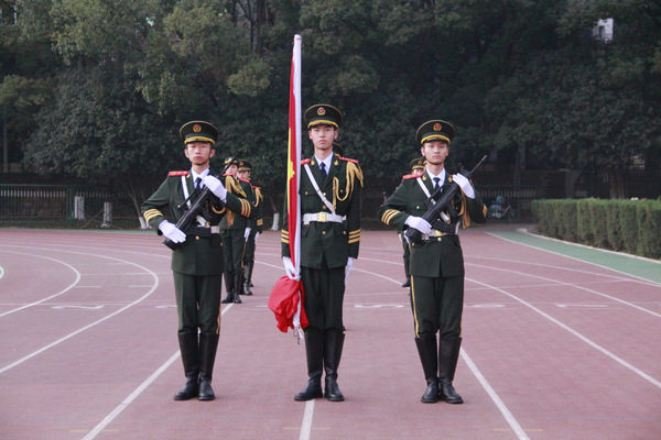 上午六时五十分,仪式准时开始。“正步走!”在一声嘹亮的口令下,气宇轩昂的国旗仪仗队迈着铿锵有力的步伐,护送鲜艳的五星红旗进入田径场。伴随着激昂的《义勇军进行曲》,五星红旗在第一缕阳光中冉冉升起,全场师生热情饱满,高唱国歌,行注目礼。