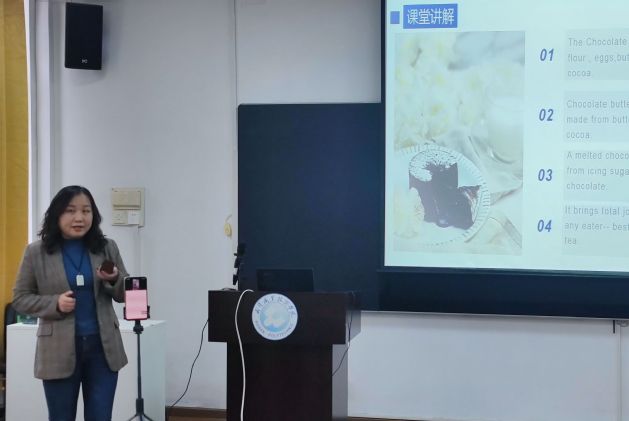 黄小蕊、匡薇、罗熙团队教学基于《商务英语》专业课程教学内容,教学展示紧扣热点话题,以北京2022年冬奥会吉祥物冰墩墩引入教学,剖析如何在产品描述中找准卖点(USP),生动有趣。匡薇老师以本土品牌仟吉的蛋糕实物为教具,层层递进,讲解优质USP打造策略。