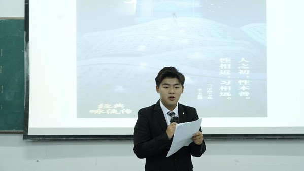 在诵红色经典箴言活动中,空乘21303班沈昊杰声情并茂、情感真挚,富有韵味和感染力。他真实饱满的情绪表达引发现场学生积极共鸣,纷纷上台参与诵读。