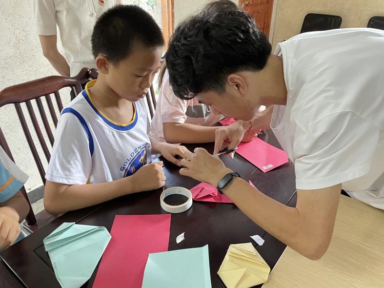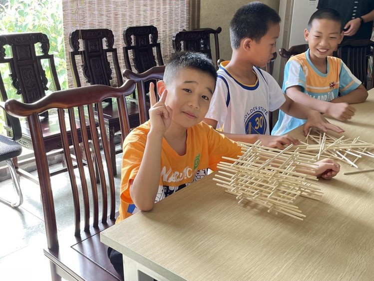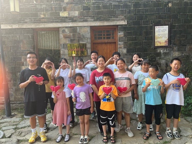 在金岭村青年之家,团队同村里的孩子们进行了“红色党史我来讲”、“建筑知识小讲堂”、“红心闪闪向未来”等互动活动。队员范海鑫分享了这些天的经历和收获,“沿着红色革命道路,了解了革命历程的艰辛,感悟到革命先烈面对挫折挑战的勇气和精神。”在建筑知识小讲堂环节,涂铭铭带领着充满好奇心的孩子们实地观察了当地建筑,带领孩子们进行了”用筷子搭建模型”的动手活动。在活动中,孩子们兴奋地讨论着收获的知识,争先恐后回答问题。杨康在“红心闪闪向未来”手工活动中耐心教授小朋友们制作自己的“闪闪红心”,一颗颗红色爱心,寄寓了孩子们的理想和目标:颜思涵小朋友理想是当一名医生,希望能去一趟北京观看冬奥会和长城;沈鑫磊小朋友希望家人平平安安健健康康。还有一些小朋友把心愿纸条塞进闪闪的红心,这一颗颗稚嫩的心蕴藏着着孩童们的远大的理想和目标。