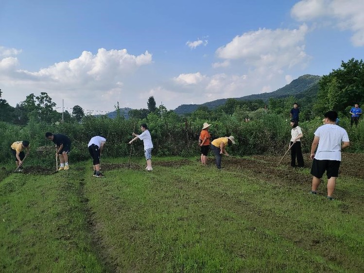 队员们得知村里有一块地需要松土、播种,主动请缨下田干活,分担农耕任务。七月的午后光芒刺眼,烈日炎炎,田里的土很软,一脚下去鞋子仿佛涂了粘胶一般,加上火辣的太阳,没多久汗水就如雨般倾落。农民伯伯细心教导农活技巧,在一次次尝试中,队员们渐渐掌握了窍门,动作开展熟练起来。短短两个小时,就完成了大半任务。通过这次实战演练,大家亲身体会到了粮食的来之不易。