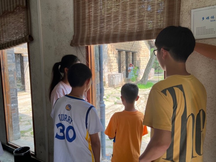 踏着青石板拾级而上,触摸充满岁月痕迹的古砖,抬头仰望古老的榫卯,队员们结合所学专业知识,彼此分享古居的建筑构造和建筑材料。漫步至红色记忆小屋,实践队员们参观学习了在革命峥嵘岁月,金岭人民通过高腔皮影、钢镰大鼓等金岭特色文化形式诵唱红色革命的英雄事迹。