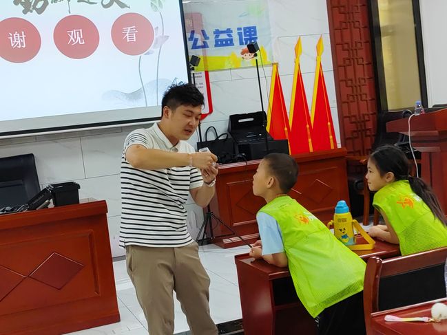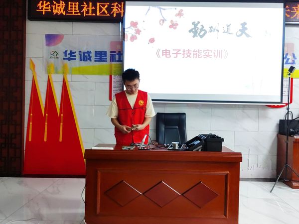 课程进入第二单元焊接电子技能知识普及。志愿者向小朋友展示了自己用电路板制作的各种电子器材小物件,介绍了电子技能基础操作技能,与小朋友们互动做游戏,演示电子技能实训趣味课程。