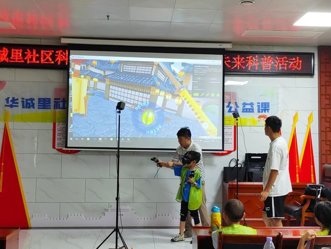 科普课程伊始,肖愚利用身边的VR相关物件引出本次科普课程的要内容,向小朋友们介绍了“VR”的前世、今生、未来发展与应用理论基础知识。随后,志愿者带领小朋友们现场体验了VR眼镜、VR手柄游戏。课堂内容幽默有趣,小朋友们的兴趣被激发,纷纷主动参与VR操作尝试体验,直呼“神奇,过瘾”。