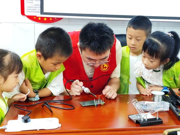 志愿者邀请小朋友们近距离观看小电板焊接,感受电子技能趣味世界