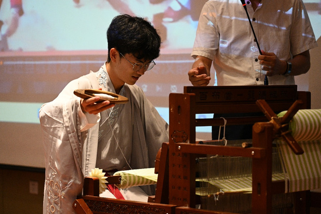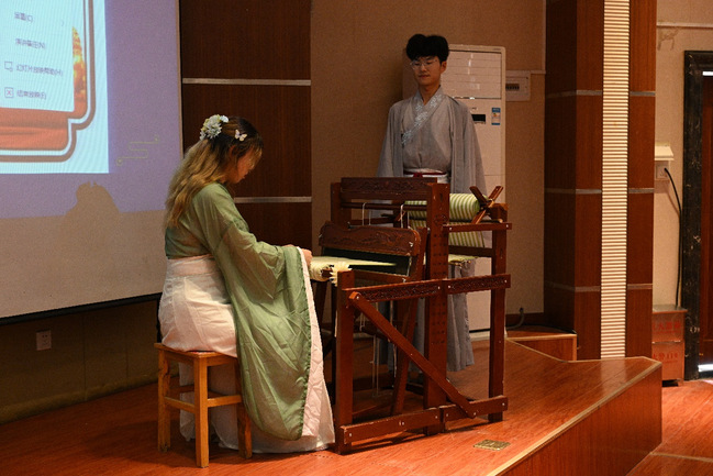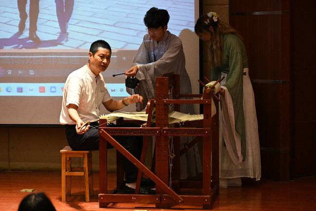 “唧唧复唧唧、木兰当户织,不问机杼声……这就是机杼的声音。”讲座伊始,刘大友以教古法手工织布机与师生互动,营造气氛,引出关于非遗文化传承话题。课堂以“讲,动”两种形式展开,加上有奖问答环节,让传媒学子从中体会非遗的魅力。
