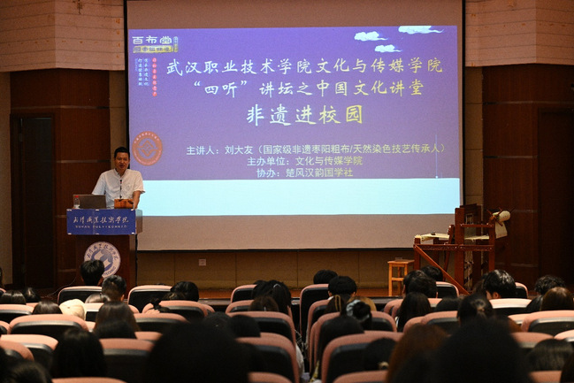 武职网讯(通讯员 黄博韬 大学生记者 袁若彤 韩玉麟)一匹枣阳粗布,织就时代华章。近日,国家级非遗“枣阳粗布/天然染色技艺“传承人刘大友应邀走进凌峰楼C21报告厅,为传媒学子带来一场别开生面的非遗文化讲座。该讲座由文化与传媒学院主办,楚风汉韵国学社协办,是“四听”(听思、听学、听技、听德)讲坛第五讲。
