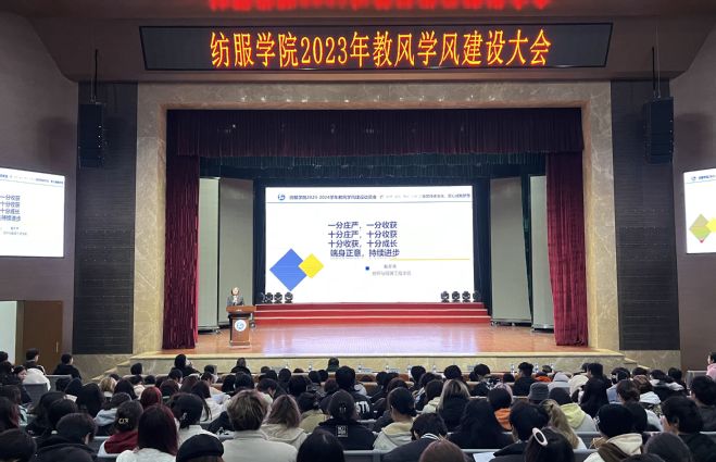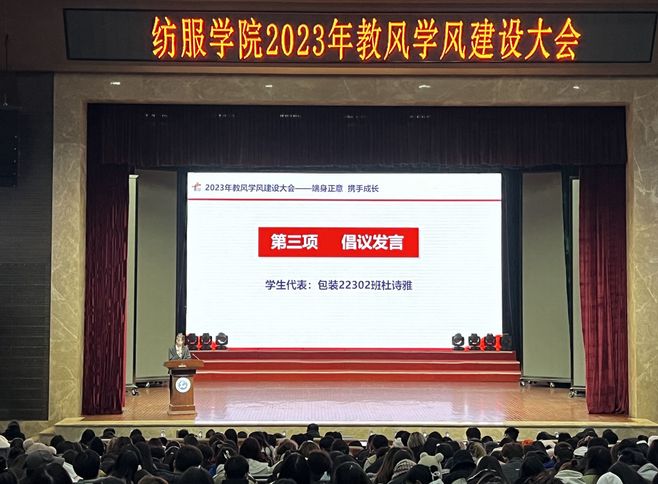 武职网讯(通讯员 耿小虎 大学生记者 于笑贺)11月30日晚,纺织与服装工程学院(简称“纺服学院”)在德礼堂举行“端身正意,携手成长”2023年教风学风建设大会,纺服学院全体师生参会。