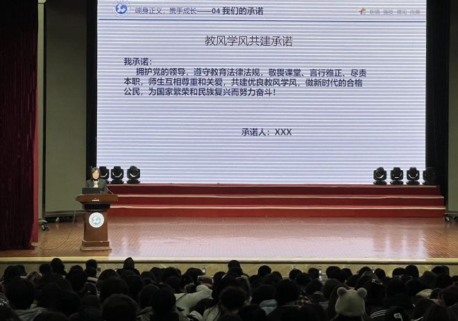 “全体师生要感恩于这个伟大的时代,要有为实现中华民族伟大复兴的中国梦而敢于吃苦、勇于担责、修炼本领的决心,用实际行动参与时代的伟大战斗。”会上,戴冬秀带领全体师生宣读《教风学风共建承诺书》。