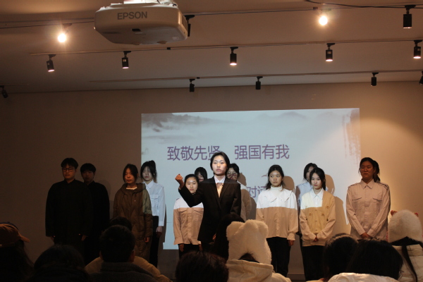 由药营23302班表演的话剧《跨越时空的对话》,展示了两个时空下的心灵互动。看着先烈们为了心中的理想将生死置之度外毅然走向硝烟深处,现代时空里坐在窗明几净教室里学习的青年不禁流下热泪,感激先辈的付出,并承诺一定接过这面旗帜!