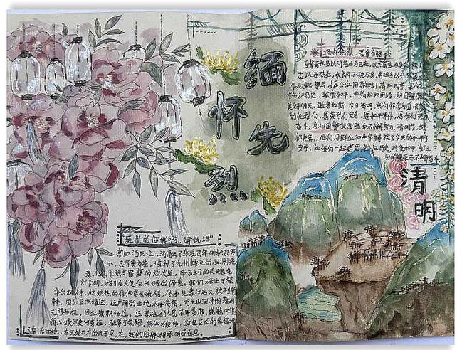 药管23302班易晴《缅怀先烈》作品用水彩绘就,灯笼、花朵、高山、柳枝相映成趣,颇见国画功底,文字内容则字字真切。她深情感叹:“我们怀念为国捐躯的先烈们,他们用鲜血和生命铸就了今天,愿我们不懈奋斗,为祖国的繁荣富强而努力!”