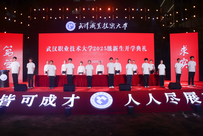 典礼上,校领导为11名新生代表佩戴校徽,象征他们正式成为“武职大人”。在外语外贸学院新生李知远的领誓下,全体新生庄严宣誓,承诺恪守校训、勤学实干,立志成长为“厚于德、勤于学、精于技、敬于业、勇于创”的新时代大国工匠。